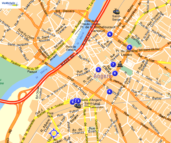 1. Le Progrès rue Denis Papin - 41 ch 52/60 2. France place de la gare - 56 ch 86/120 3. Grand hôtel de la gare place de la gare - 52 ch 45/65 4. Europe rue du Château Gontier - 29 ch 42/56 5. Continental rue de Romain - 25 ch 45/58 6. Anjou boulevard du maréchal Foch - 53 ch 103/166 7. Mail rue des Ursules - 84 ch 98/110 8. Royalty boulevard Ayrault - 20 ch 41/54 9. Mercure centre place Mendès-France - 84 ch 98/110 |